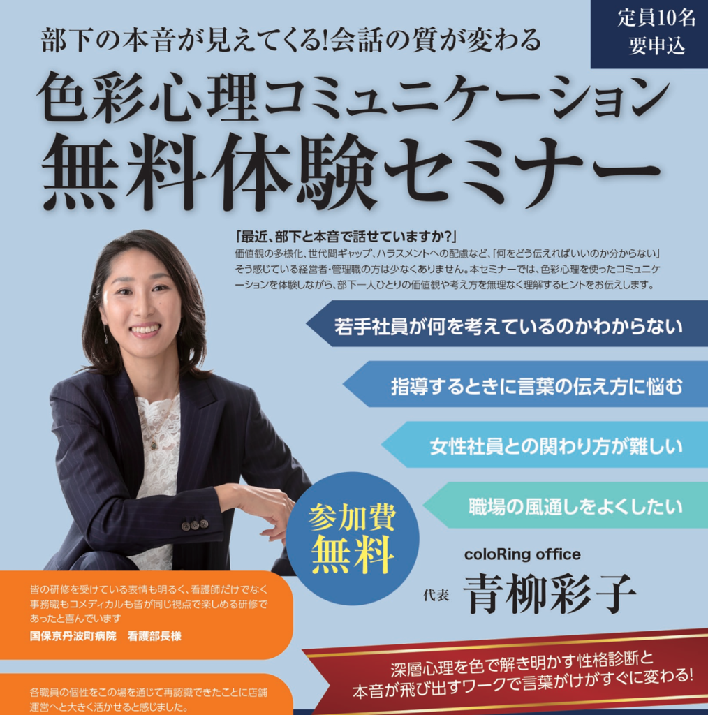 部下の本音が見えてくる! 会話の質が変わる色彩心理コミュニケーション無料体験セミナー を京都府京田辺市で開催します。 〇こんなお悩みの方へ ・若手社員が何を考えているのかわからない ・女性社員との関わり方が難しい ・指導するときに言葉の伝え方... -